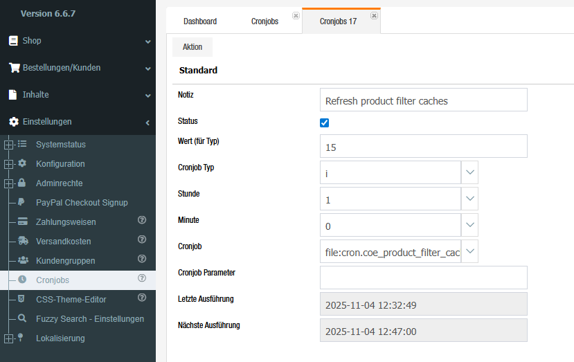 Um die Performance zu steigern kann ein Caching in der Plugin-Konfiguration aktiviert werden. Die gecachten Filter werden dann regelmäßig im Hintergrund aktualisiert. Hierfür ist ein Cronjob erforderlich, der bei der Installation des Plugins angelegt worden sein sollte. Wenn dieser fehlt, erstellen Sie diesen bitte entsprechend. Außerdem muss dieser aktiviert werden.
